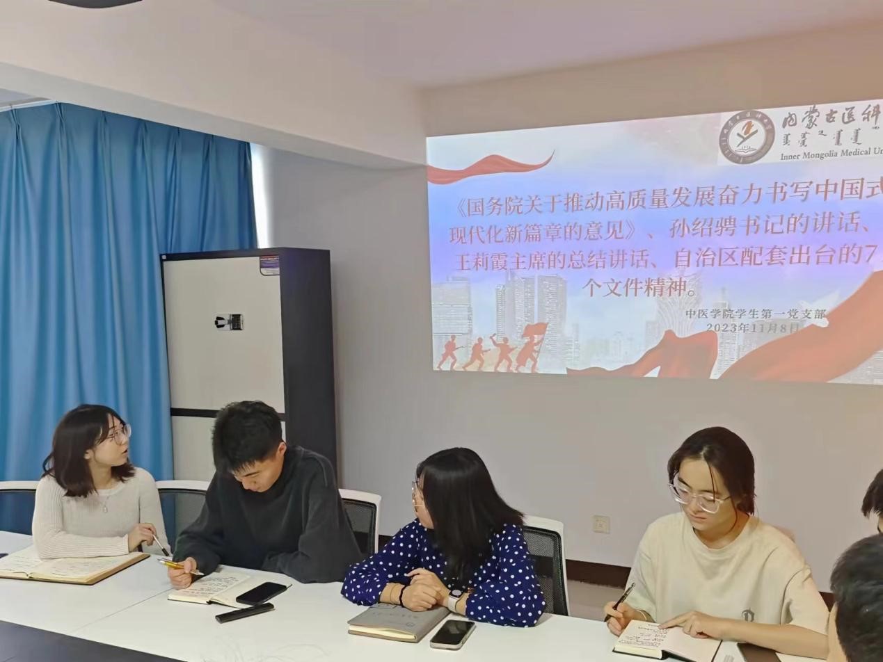 一分部署,九分落实。2023年11月8日,中医学院学生第一党支部集中学习了《国务院关于推动内蒙古高质量发展奋力书写中国式现代化新篇章的意见》、孙绍骋书记的讲话、王莉霞主席的总结讲话、自治区配套出台的7个文件精神的集中学习活动。在活动过程中学生积极与老师交流阅读心得、分享系列座谈会精神的重点内容和具体要求。