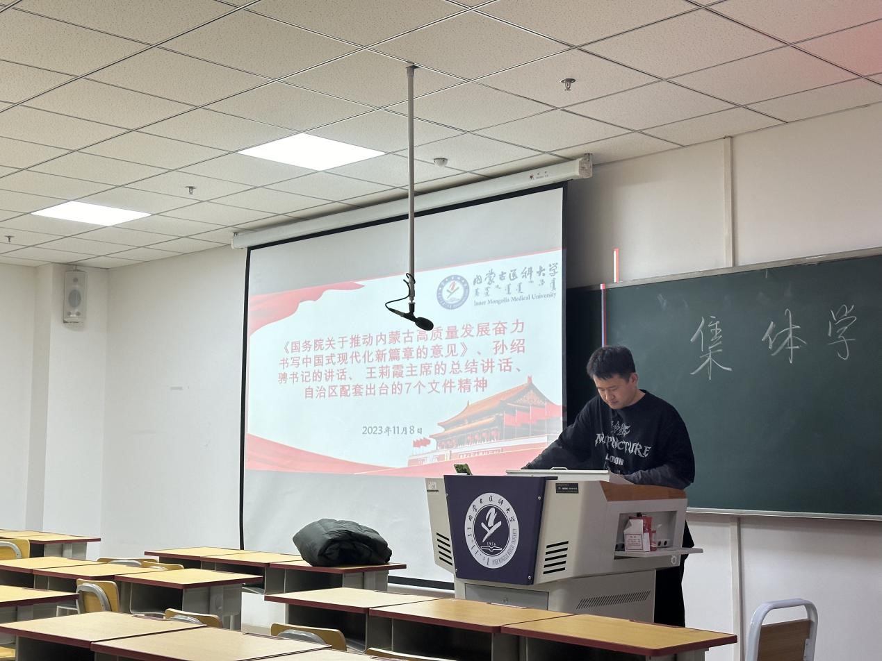 为深入贯彻落实习近平总书记重要讲话和指示批示精神,学习贯彻关于支持内蒙古以铸牢中华民族共同体意识为主线,加快落实“五大任务”,推动高质量发展,奋力书写中国式现代化内蒙古新篇章,提出的《意见》。2023年11月8日,中医学院学生第二、三党支部于新华校区307教师组织71名党员进行集体学习。