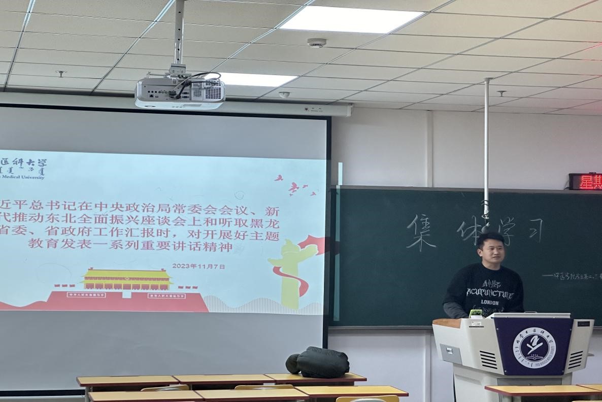 学生第二、三党支部组织全体党员集体学习习近平总书记在中央政治局常委会会议、新时代推动东北全面振兴座谈会上和听取黑龙江省委、省政府工作汇报时,对开展好主题教育发表一系列重要讲话精神