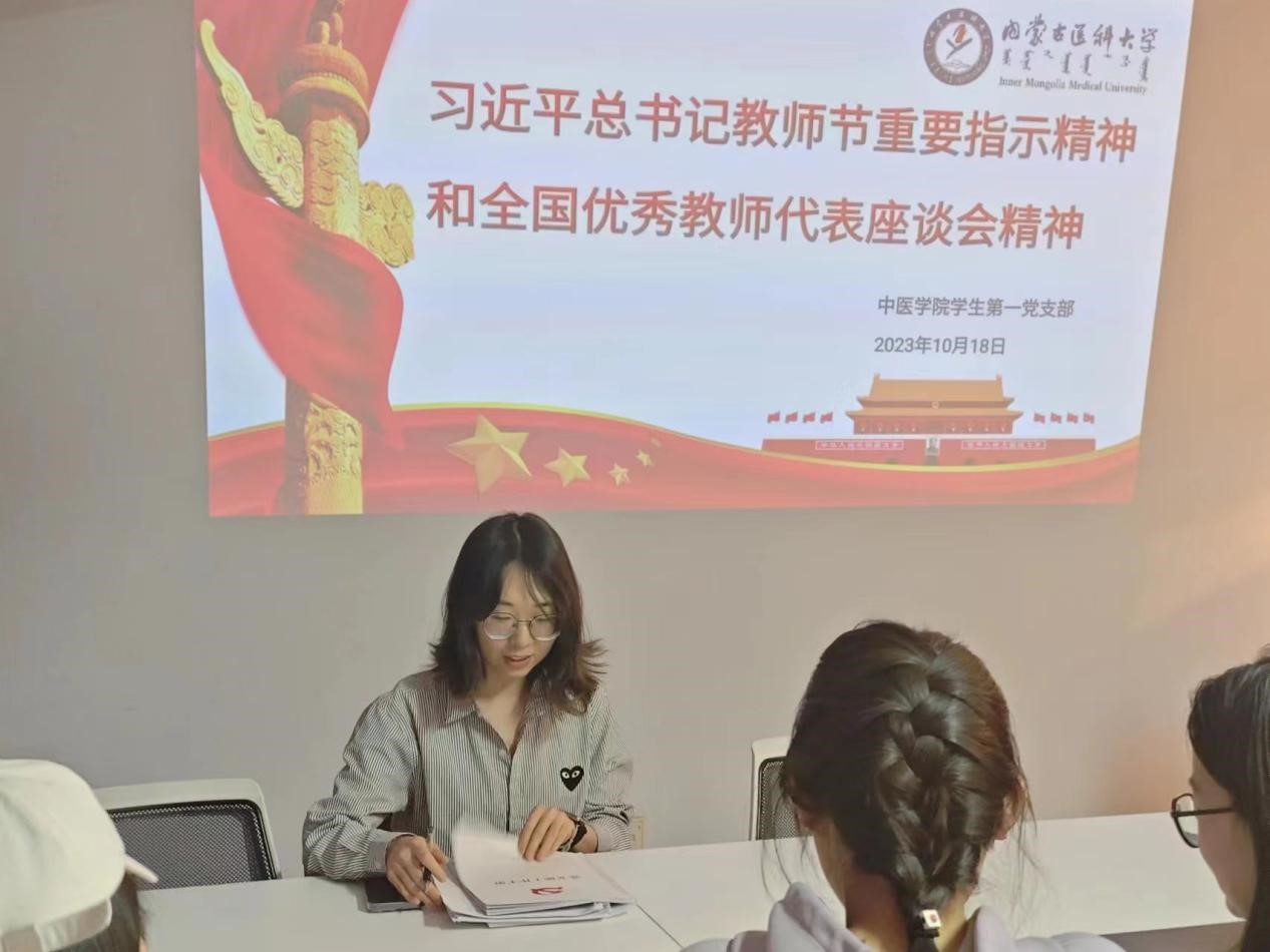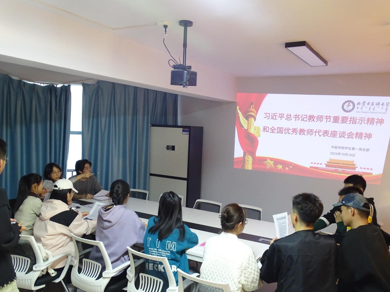 为深入学习贯彻习近平新时代中国特色社会主义思想和党的二十大精神,10月18日,中医学院学生第一党支部在党支部书记王东风、张敏老师、潘芮宁老师的带领下,开展集中学习习近平总书记教师节重要指示精神和全国优秀教师代表座谈会精神、中央教育工作领导小组秘书组、中共教育部党组印发的《关于教育系统学习贯彻习近平总书记教师节重要指示精神的通知》文件精神、习近平总书记给东北大学全体师生的回信精神的形式,在学习过程中学生积极学习总书记重要指示精神,并认真阅读学习材料。