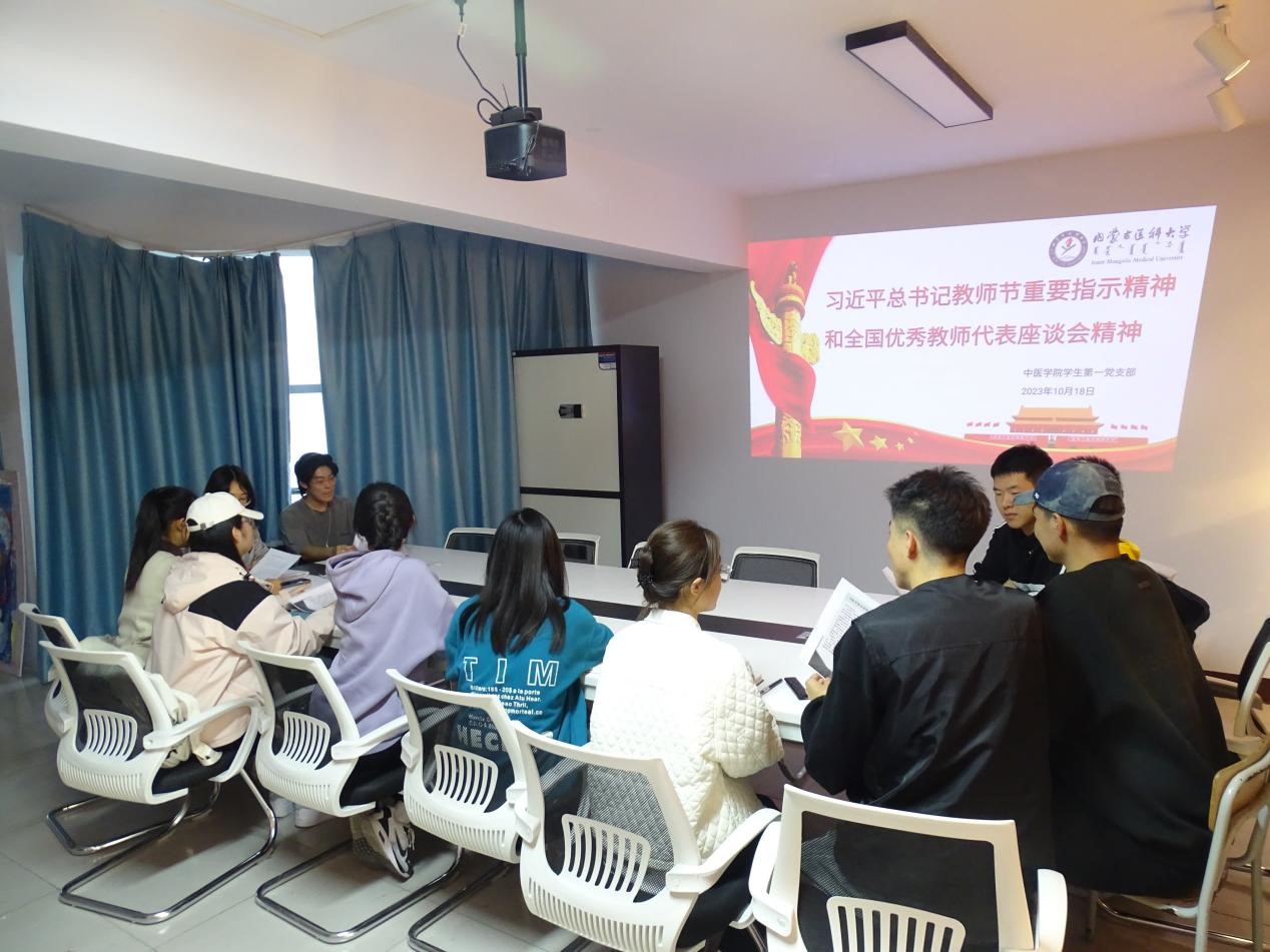 学生第一党支部集中学习学习习近平总书记教师节重要指示精神和全国优秀教师代表座谈会精神、中央教育工作领导小组秘书组、中共教育部党组印发的《关于教育系统学习贯彻习近平总书记教师节重要指示精神的通知》文件精神、习近平总书记给东北大学全体师生的回信精神