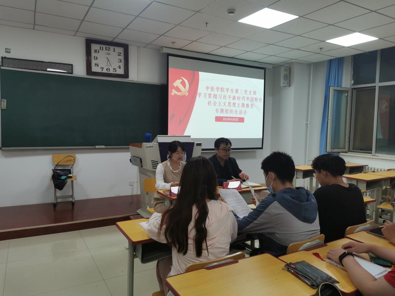9月8日下午,中医学院学生第三党支部在新华校区教学楼201教室召开学习贯彻习近平新时代中国特色社会主义思想主题教育专题组织生活。本次专题组织生活会邀请学院党委委员、综合办公室主任董重阳同志参加,会议由党支部书记王丽芬主持。