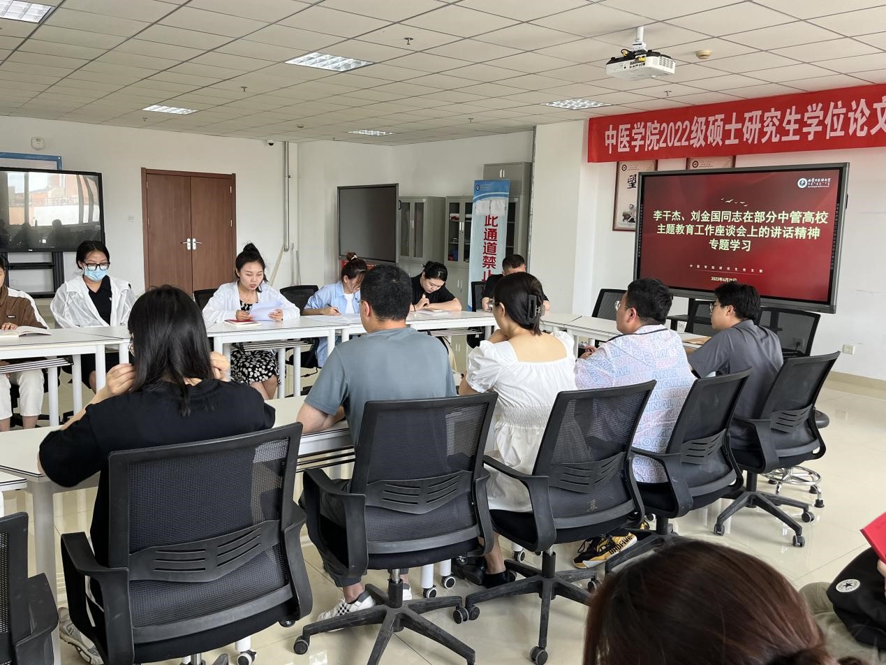 6月29日,中医学院研究生党支部召开集中学习,学习贯彻习近平总书记近期关于主题教育的重要讲话精神,学习贯彻李干杰、刘金国同志在部分省区市、中央和国家机关、中管金融企业和中管企业、中管高校主题教育工作座谈会上的讲话精神,交流运用党的创新理论解决实际问题的具体案例和体会,支部全体成员参加学习。