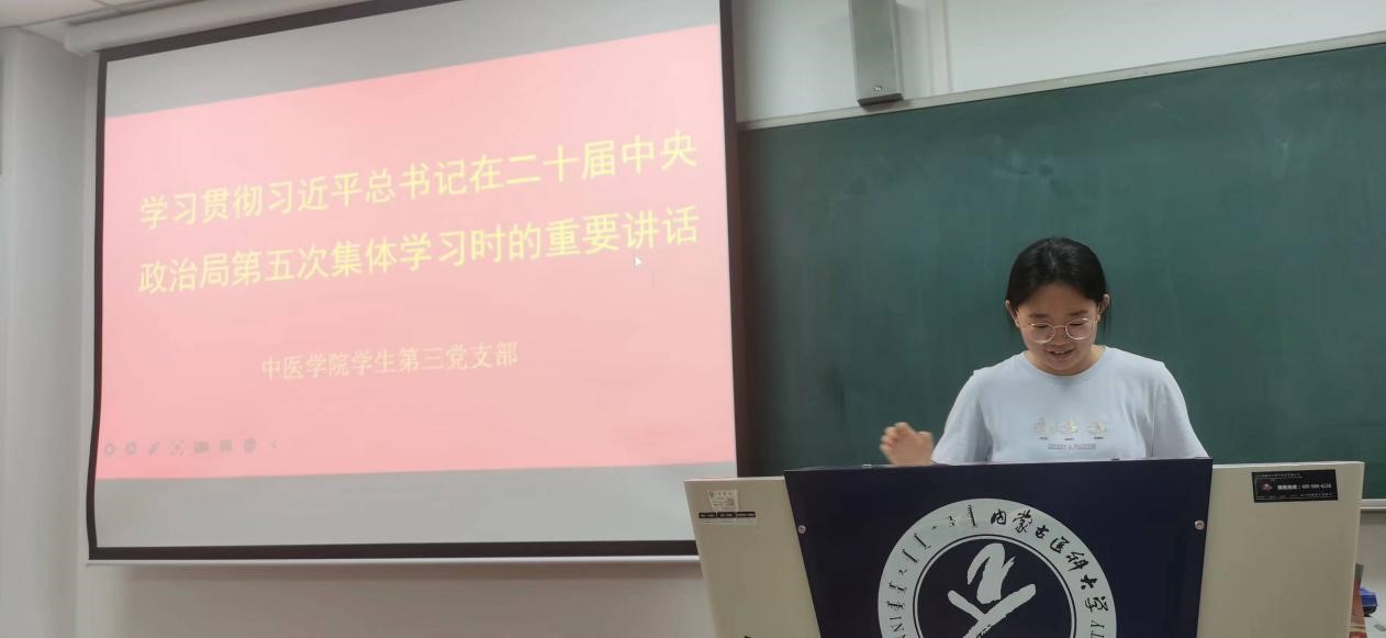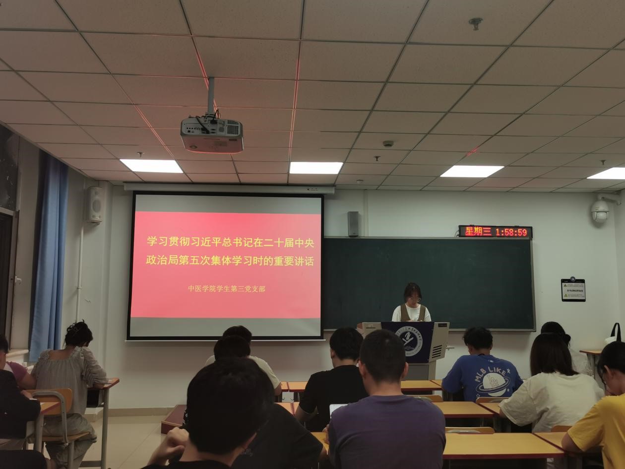 2023年6月28日下午,中医学院学生第三党支部召开专题学习会议,传达学习习近平总书记在中共中央政治局第五次集体学习时的重要讲话精神。党支部书记王丽芬及全体党员同志参加了学习会议。