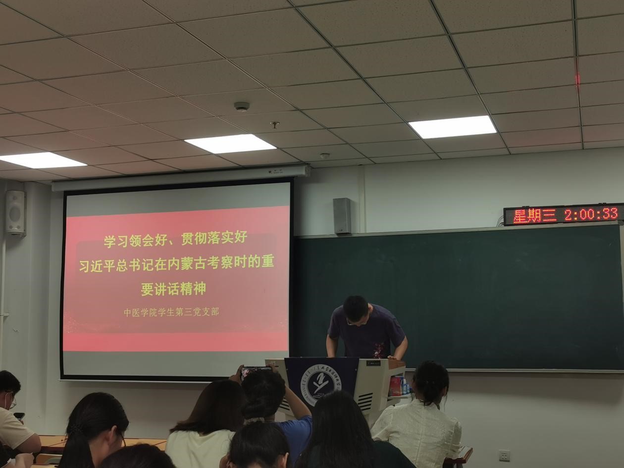 2023年6月28日,中医学院学生第三党支部召开专题学习会,党支部书记王丽芬面向全体党员领学习近平总书记在内蒙古考察时的重要讲话精神,部署学习贯彻落实工作。