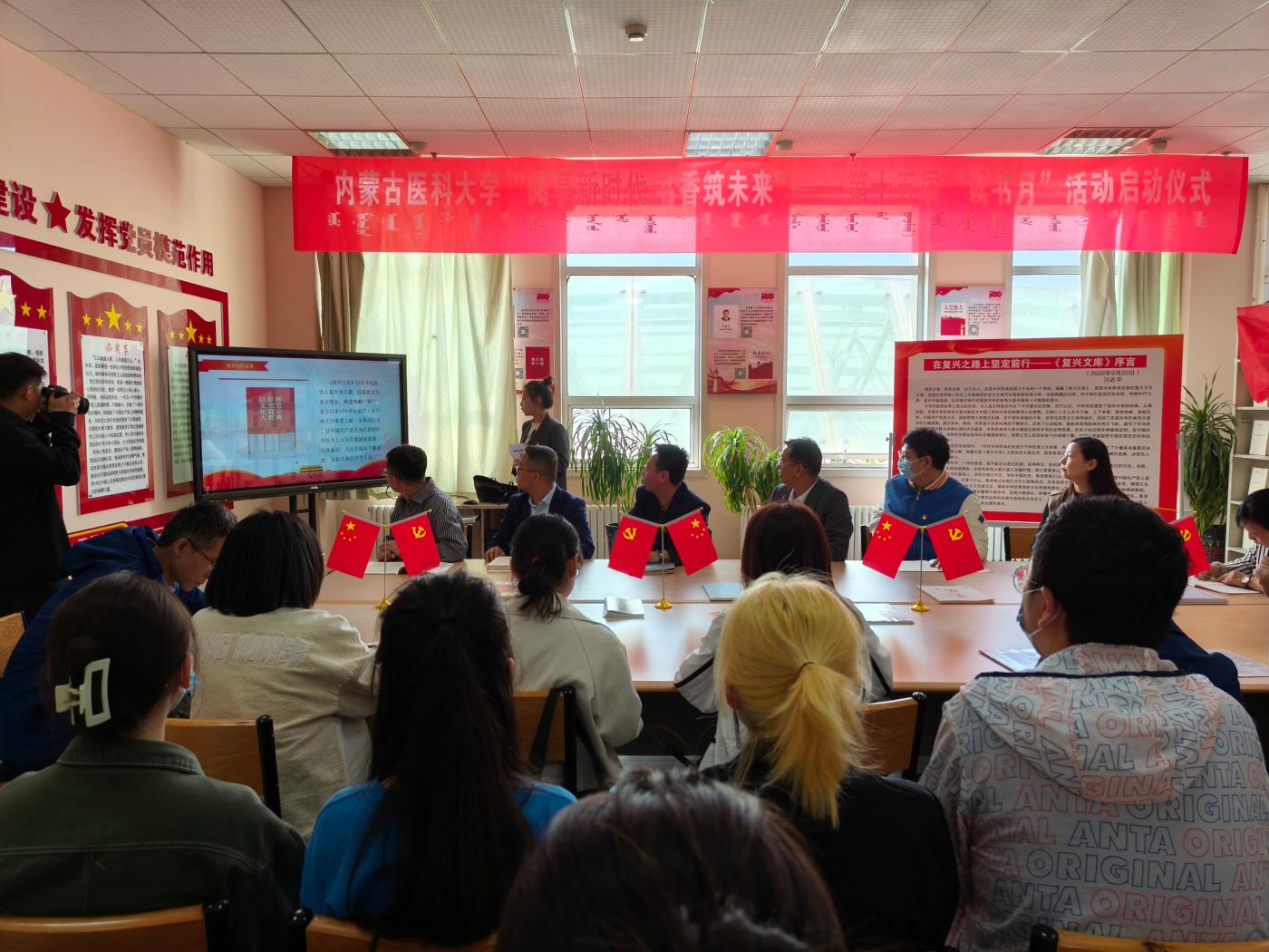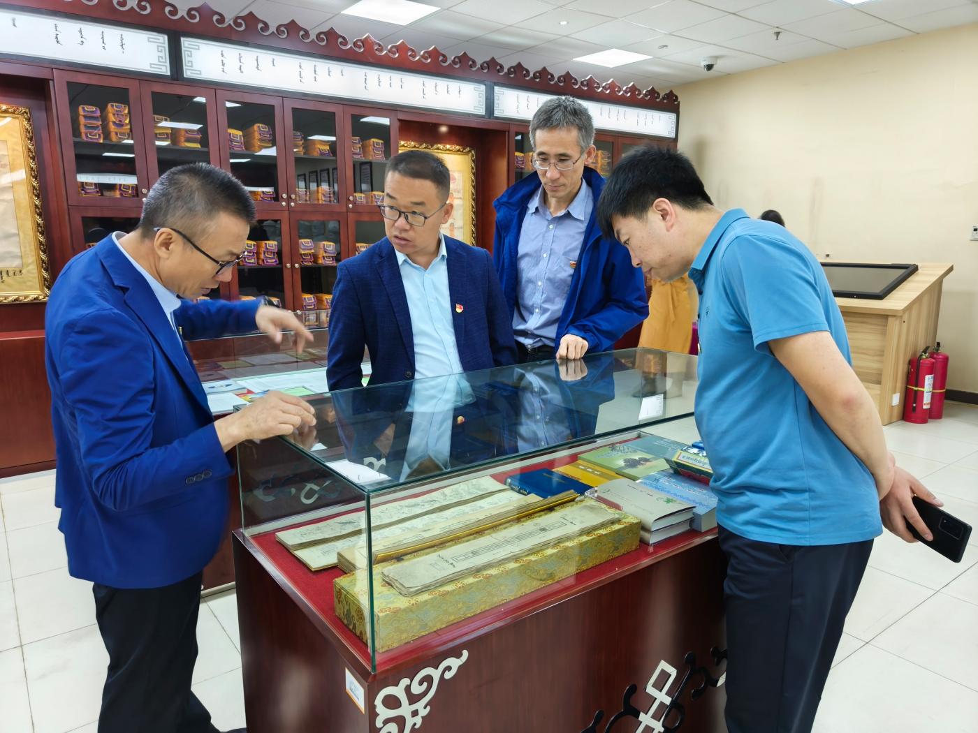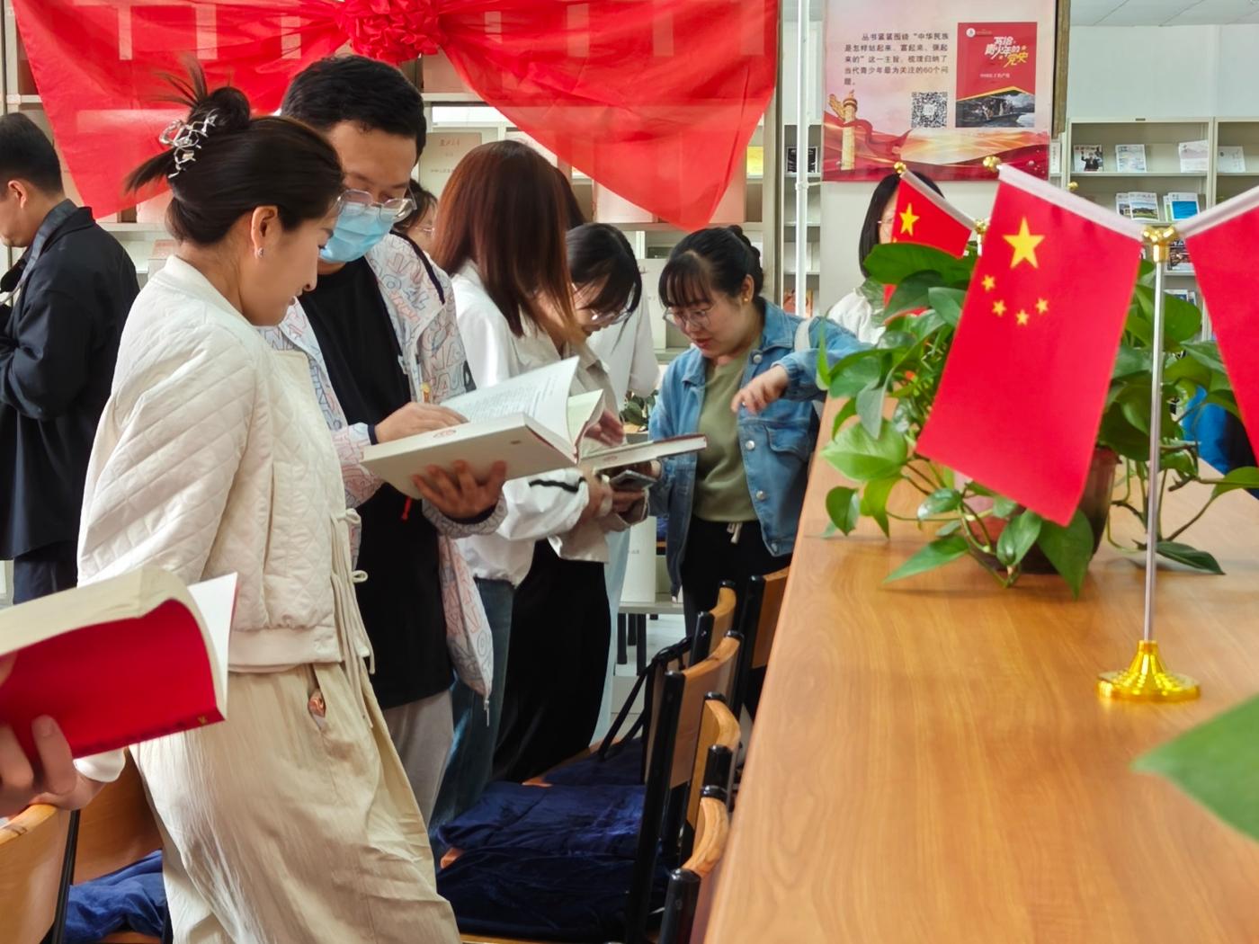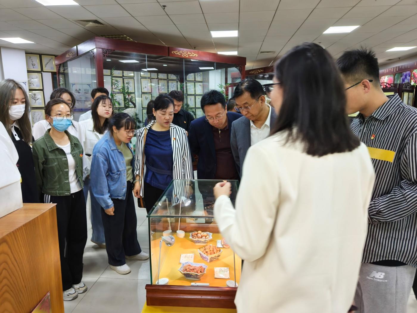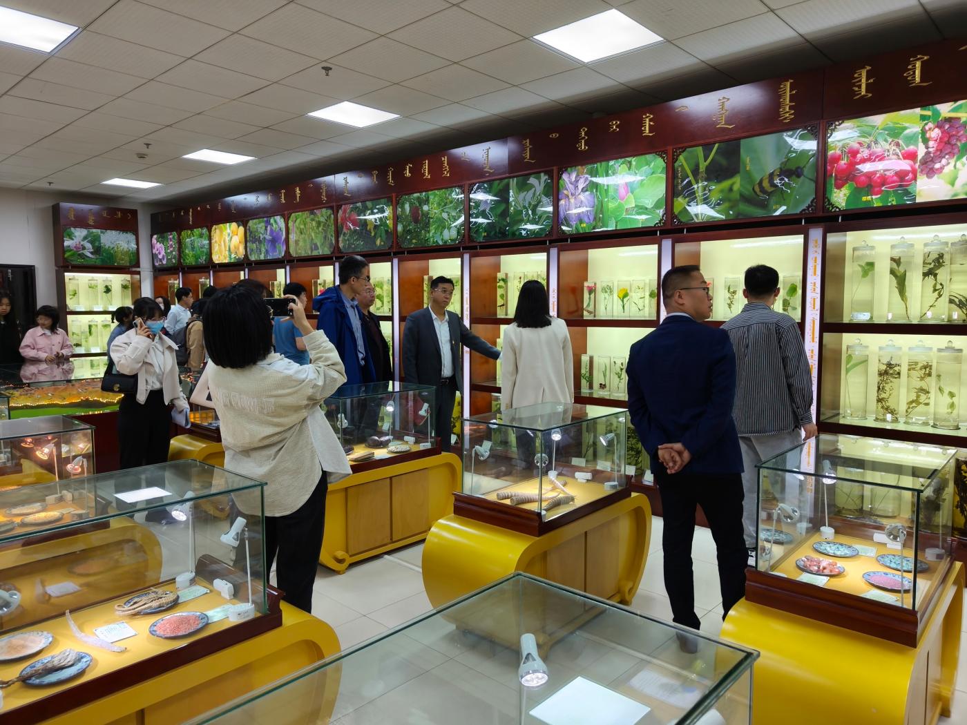 在蒙医药博物馆,讲解员现场讲解了蒙医传统疗法模拟场景、民族服饰等陈列,蒙医药博物馆作为中医药(蒙医药)文化的展示平台,让人们实实在在地感受到了中医药(蒙医药)文化的巨大魅力;在红色文献阅览室,全体师生党员参观大型历史文献丛书《复兴文库》专题书展,并现场参加诵读活动。