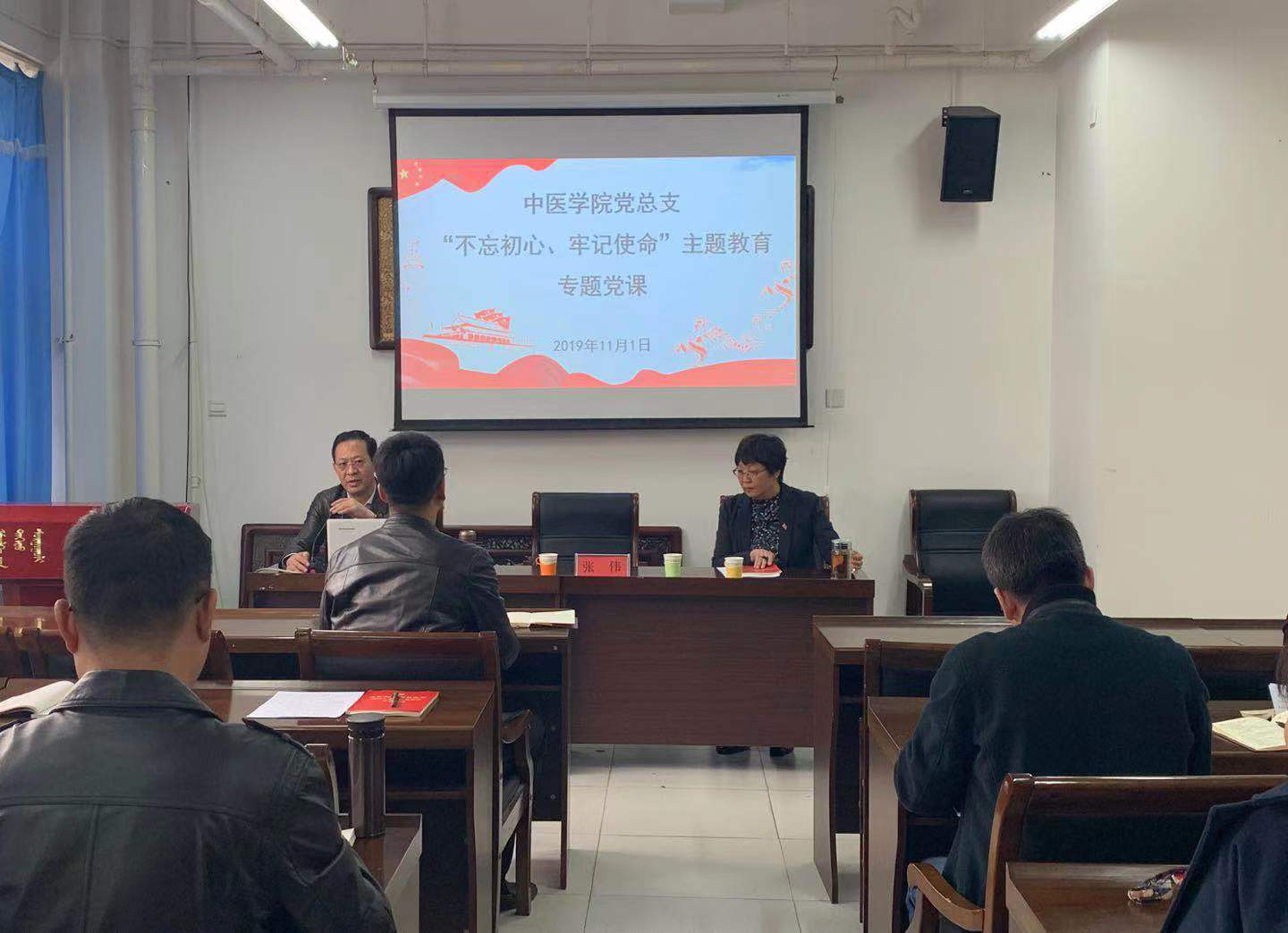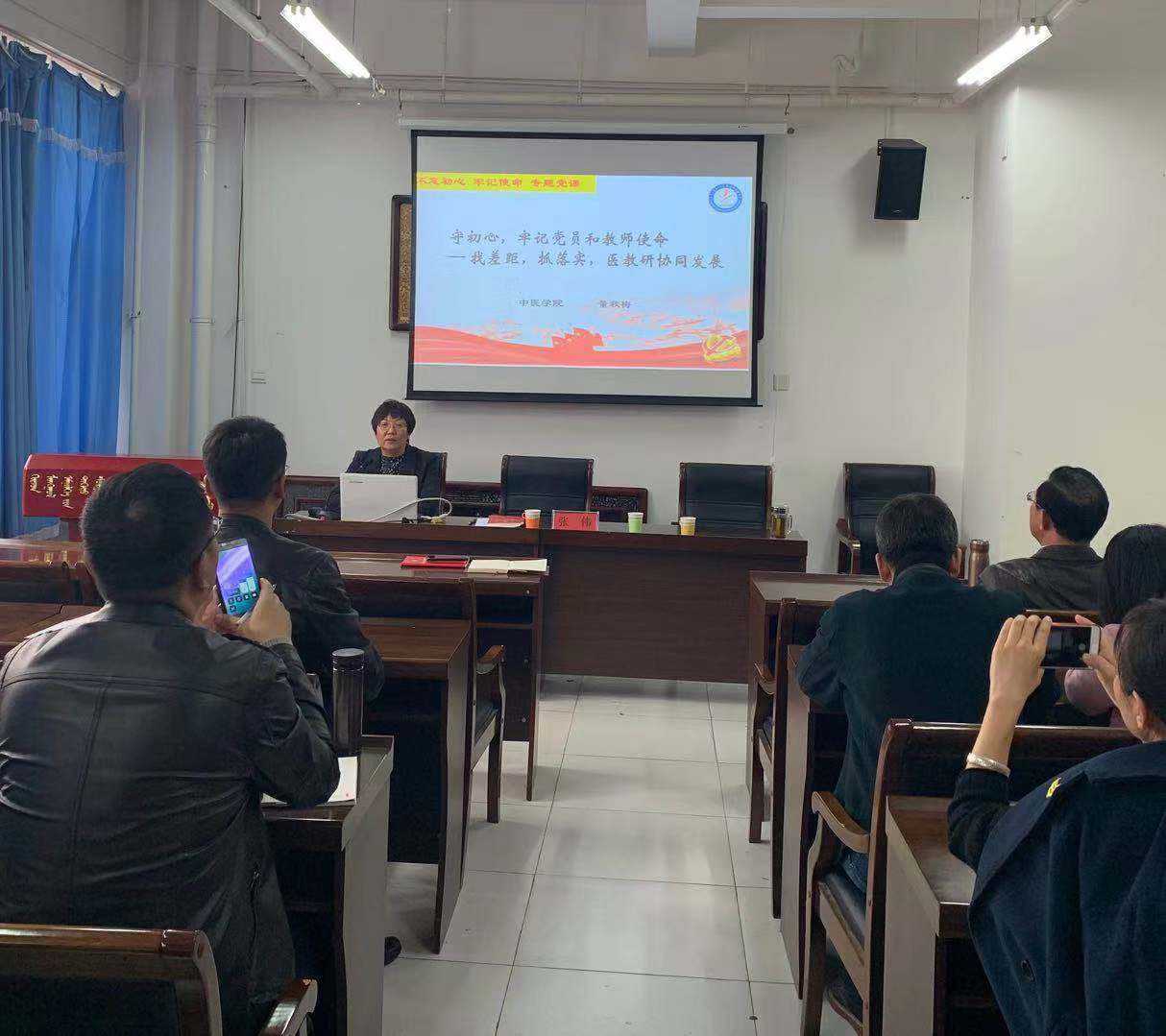 随后,学院院长董秋梅作了以《守初心,牢记党员和教师使命——找差距,抓落实,医教研协同发展》为题,讲授党课。她指出,作为一名普通教师和基层党员,如何铭记初心、实践初心、实现初心,这就要求我们在工作中把“教书育人”这个教师的责任和义务做好,投身于教育实践,着力探索教育教学规律,不断更新教育观念,扎实改革教学方法与手段,引导学生全面发展,努力培养社会主义现代化建设需要的一代新人。同时,在工作中要做好“医教研协同发展”,加强与高水平中医药大学的交流与沟通,找到差距努力补齐短板,不断从理论武装、改革开放、创新求实中获得发展的动力。