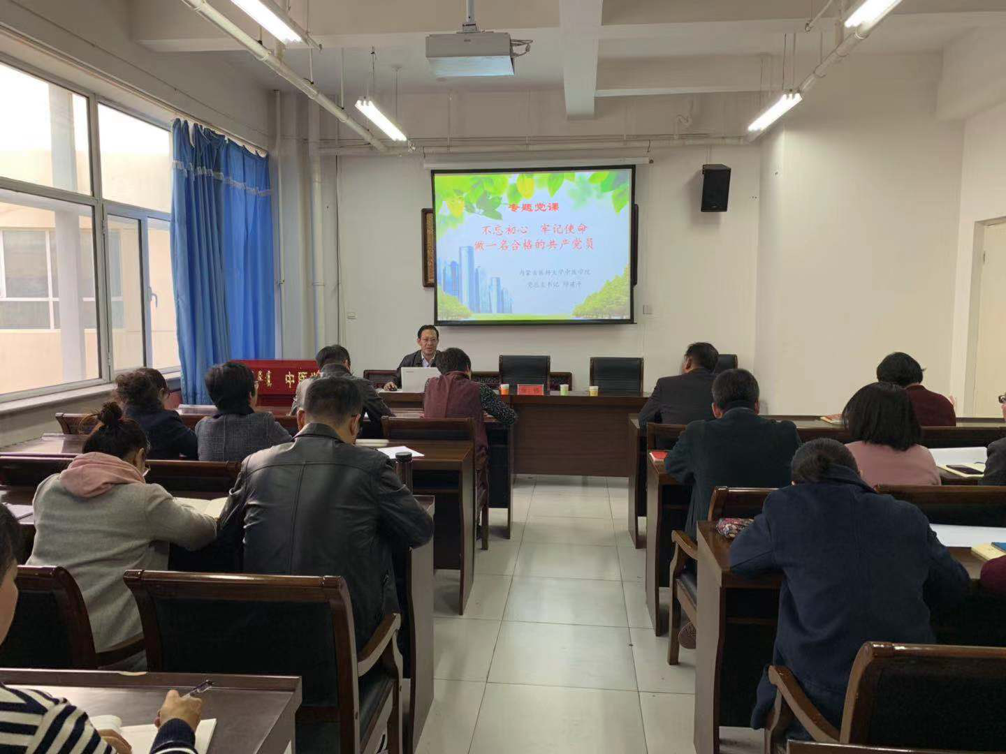 学院党总支书记师建平以《“不忘初心、牢记使命”——做一名合格党员》为题,讲授党课。他指出,党的十九大以来,习近平总书记在多次考察、讲话中,从树立党章意识、坚定理想信念等层面阐述了共产党员如何加强党性,始终心系党、心系人民、心系国家,体现先进性和纯洁性。那么面对时代发展的新形势、新挑战,做“一名合格共产党员”就要讲政治、有信念,讲规矩、有纪律,讲道德、有品行,讲奉献、有作为。牢记自我角色,强化党员意识,严格遵守党的纪律,特别是政治纪律和组织纪律,始终把廉洁自律当作政治必修课来认真对待,要做到清清白白做人、干干净净做事、坦坦荡荡为官。工作中要积极践行宗旨意识,做到时时处处想着师生员工,真心实意地去为大家办实事、办好事。