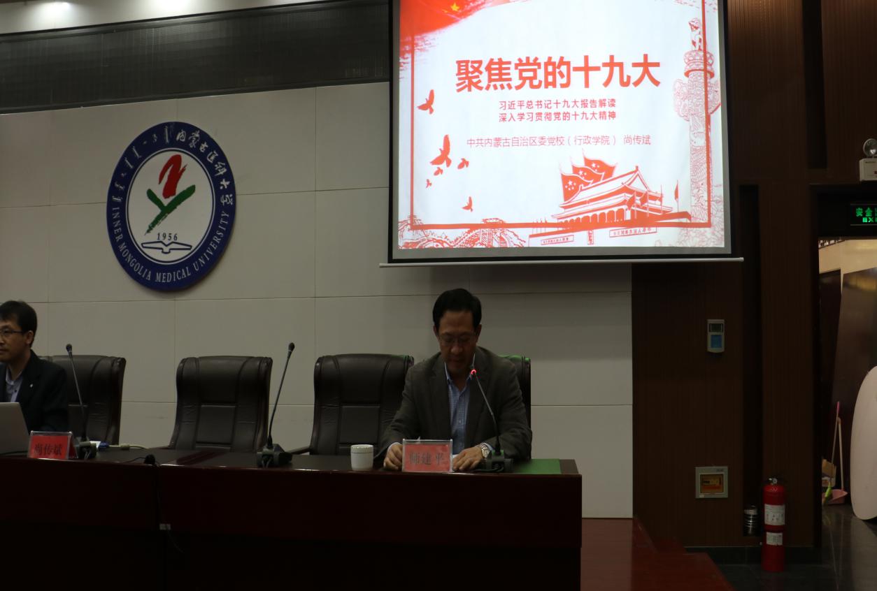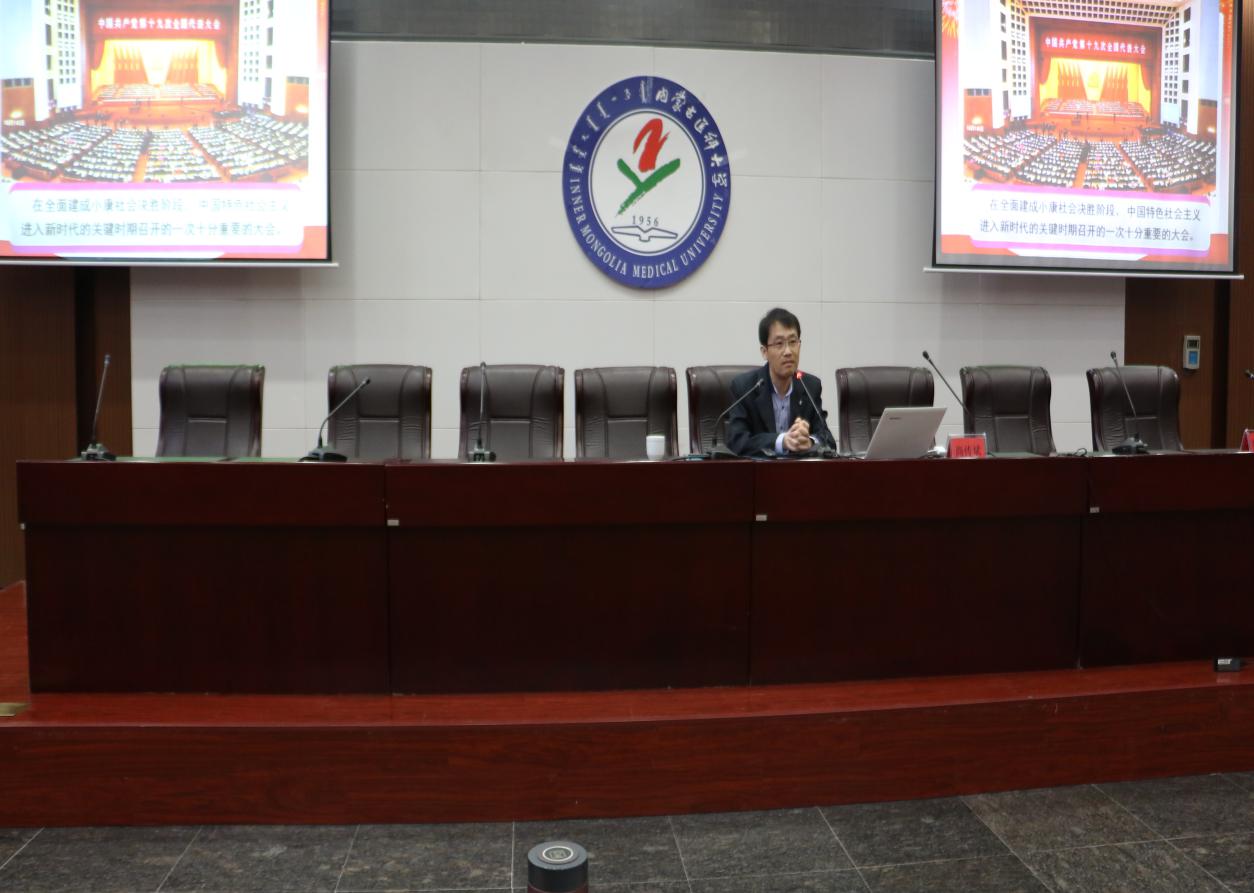 2017年10月30日下午,中医学院、基础医学院、药学院、蒙医药学院在金山校区国际交流中心报告厅联合举办十九大学习教育党课,特邀请内蒙古自治区党校(行政学院)尚传斌副教授,以“决胜全面建成小康社会,夺取新时代中国特色社会主义伟大胜利”为题为广大师生作了一场精彩的主题讲座。中医学院、基础医学院、药学院、蒙医药学院总支委员、党支部书记、全体教职工党员和学生党员共200多人参加了本次学习活动。讲座由中医学院党总支书记师建平主持。