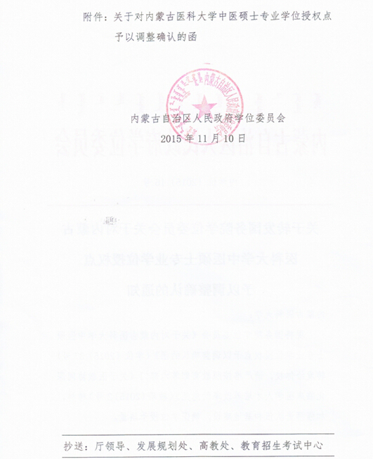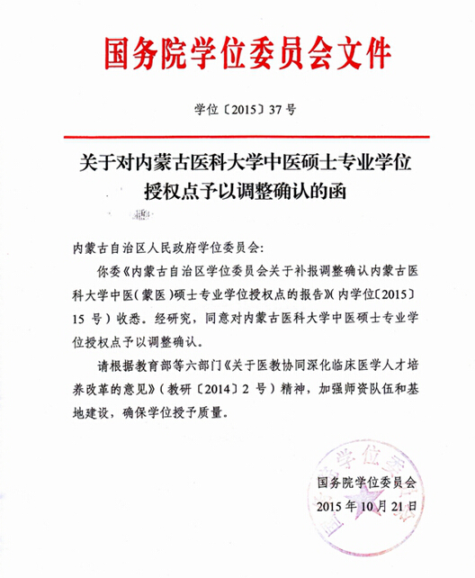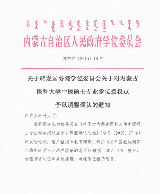 近日,国务院学位委员会和内蒙古自治区学位委员会分别下发了《关于对内蒙古医科大学中医硕士专业学位授权点予以调整确认的函》(学位[2015]37号)和《关于转发国务院学位委员会关于对内蒙古医科大学中医硕士专业学位授权点予以调整确认的通知》(内学位[2015]16号)。经国务院学位委员会审议研究,同意对我校中医硕士专业学位点予以调整确认。