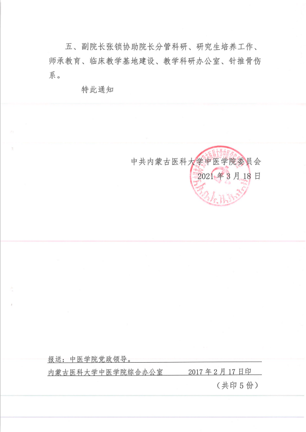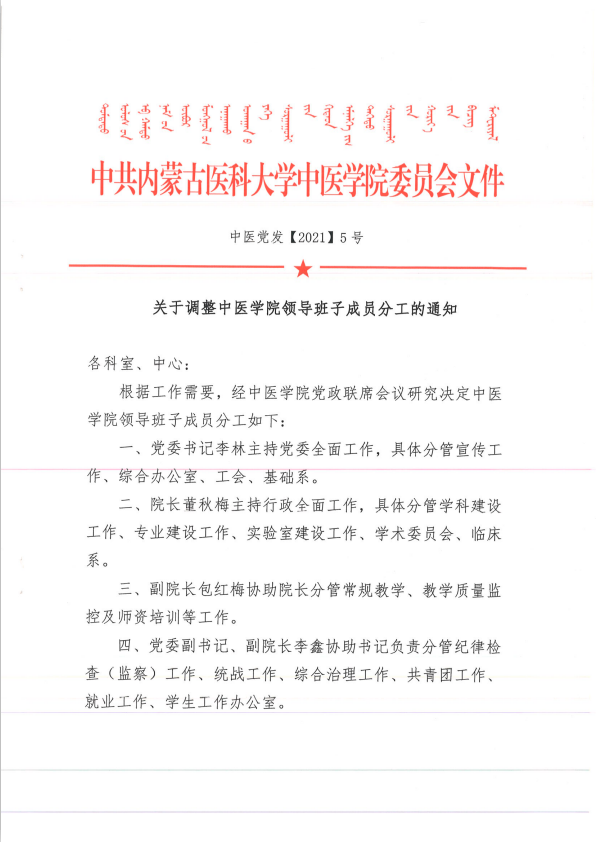 中医党发【2021】5号 关于调整中医学院领导班子成员分工的通知