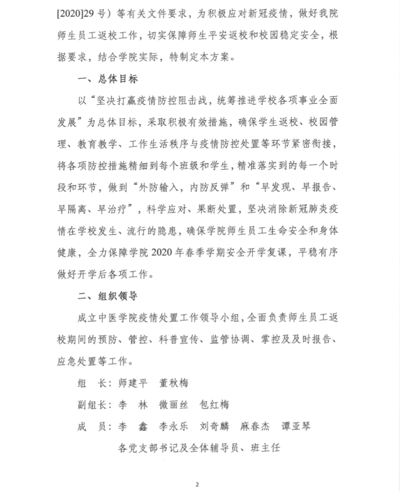 关于中医学院2020年春季学期开学复课和新冠肺炎疫情防控工作的实施方案