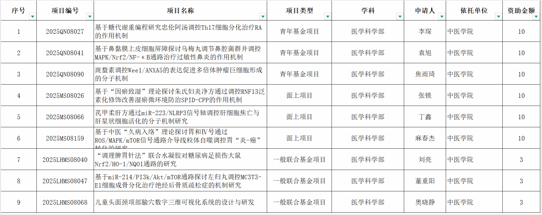 喜报--中医学院获批9项2025年度自治区自然科学基金 近日,根据内蒙古自治区科学技术厅公布了《关于批准资助 2025 年度第一批自治区自然科学基金项目的通知》,我院教师主持申报的9个项目获批立项,其中包括3个面上项目、3个青年基金项目、3个一般联合基金项目(具体见下表)。